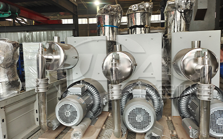 真空上料機由真空泵(無油、無水)、覆膜濾袋過濾器、壓縮空氣反吹裝置、氣動放料門裝置、真空料斗和不銹鋼可調吸料槍、輸送軟管等部件組成。真空上料機有以下幾個特點:
