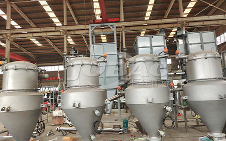 當壓縮空氣供給真空發生器時,料斗的放料門在氣缸推動下關閉,真空發生器就產生負壓形成真空氣流,在這股氣流的作用下,被輸送的物料經軟管被輸送到真空料斗中,且通過濾器組件使料倉與真空發生器分離。一定時間后(上料時間)關閉壓縮空氣,真空發生器無法產生真空,同時料斗的放料門在氣缸推動下開啟,真空加料機真空消失,物料從放料門自動放入受料設備中,儲存在氣包中的壓縮空氣反吹過濾器,過濾器自動清洗。一定時間后(放料時間)壓縮空氣重新啟動,再次重復以上動作,如此循環,周而復始,物料被源源不斷地送入受料設備中。