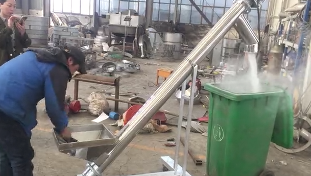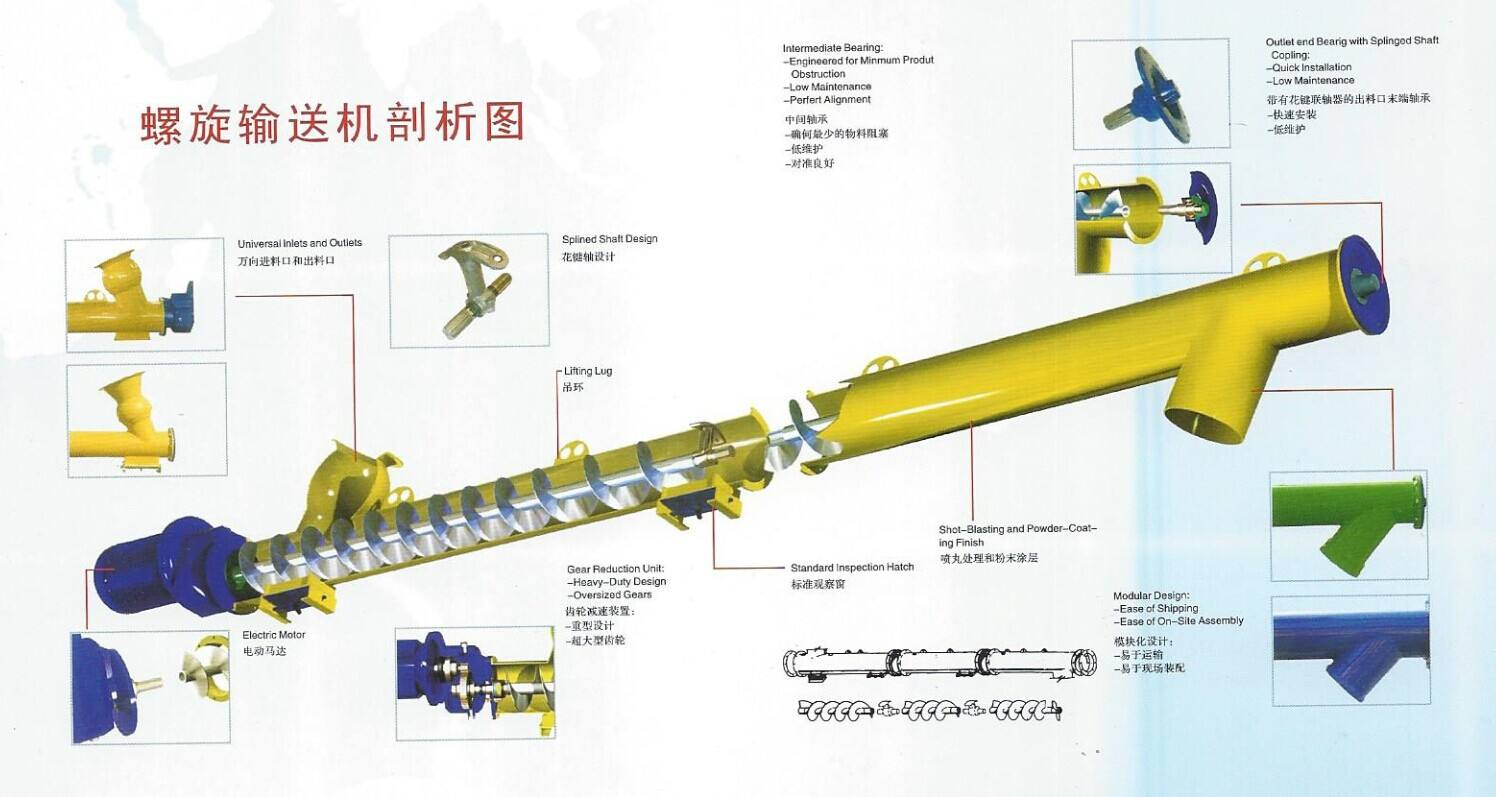 螺旋輸送機。使物料前進的螺旋葉片稱為刮板。大部分安裝在輸送機出料端的驅動電機使螺旋葉片旋轉。