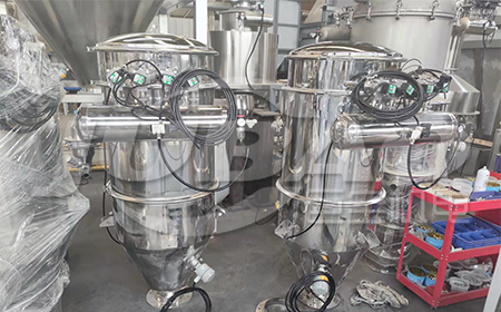 對于真空上料機的連續(xù)輸送方式,有以下幾種情況:我們可以在上料機的出料口安裝關(guān)風機,使料倉內(nèi)部始終保持真空狀態(tài),這樣就可以形成一個連續(xù)式真空上料系統(tǒng);還可采用兩臺間歇式真空上料機進行串聯(lián),在上下料時間上進行調(diào)節(jié)使其互補,一臺上料儲備,一臺下料,交替進行,如此往復,以此來達到連續(xù)上料的目的。